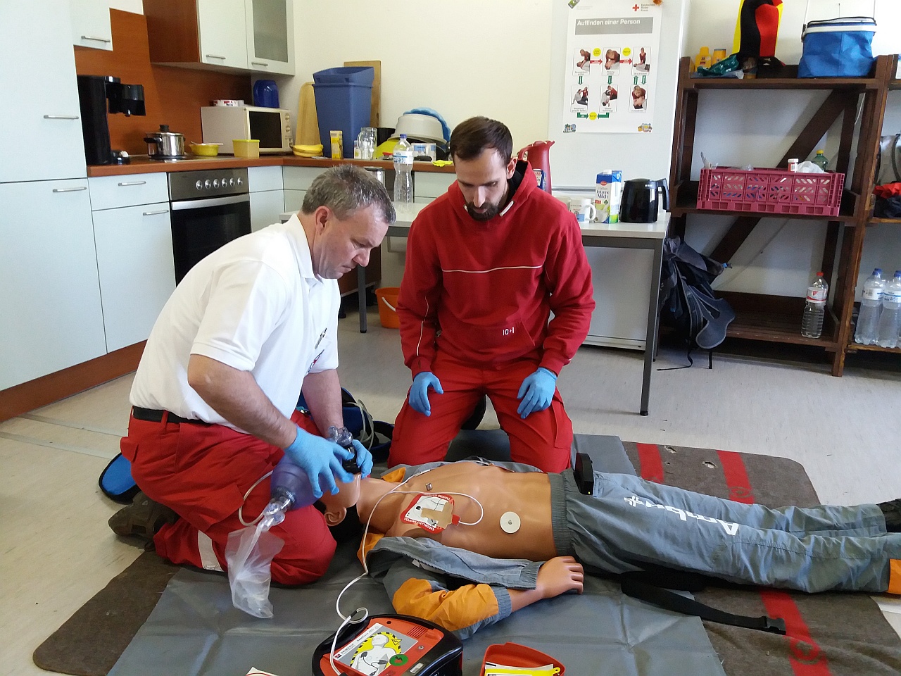 So wechseln die Themen nur punktuell von Jahr zu Jahr. Wie jedes Jahr wurde das Blutdruckmessen, das Puls fühlen und auszählen sowie das Vorbereiten einer Infussion und einer Injektion geübt. Mit der neuen Übungspupe für die Herz-Lungen-Wiederbelebung haben alle Teilnehmer ebenso die HLM zusammen mit dem Einsatz des AED und eines Beatmungsbeutels mit Sauerstoffanschluss geübt.