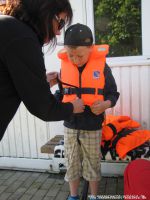Obwohl es an diesem Tag die Sonne recht gut meinte, wurde auf eine lustige, sportliche Erwärmung nicht verzichtet. Danach ging es, aufgeteilt in zwei Gruppen, zum einen an das Einsatzfahrzeug und zum anderen an das Rettungsboot der Wasserwacht. Selbstverständlich mussten die Bootsfahrer alle erstmal die knallig farbenen Rettungswesten anlegen, bevor sie einsteigen durften. In schneller Fahrt, mit typischen Bootsmanövern düste man jetzt über den Stausee. Im Boot gab es natürlich viele Fragen von den Kinder, die gerne und umfangreich beantwortet wurden.